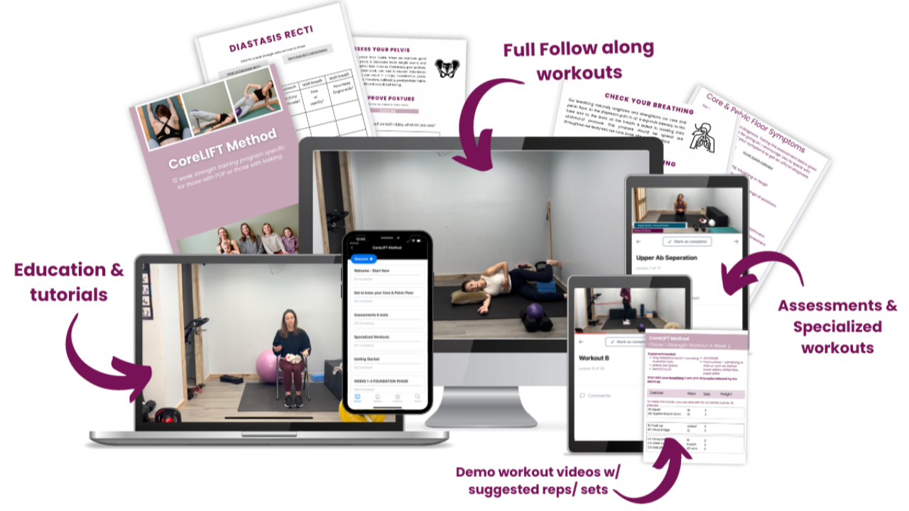 - Training modules specific to prolapse, tightness, posture barriers, diastasis & leaking with exercise